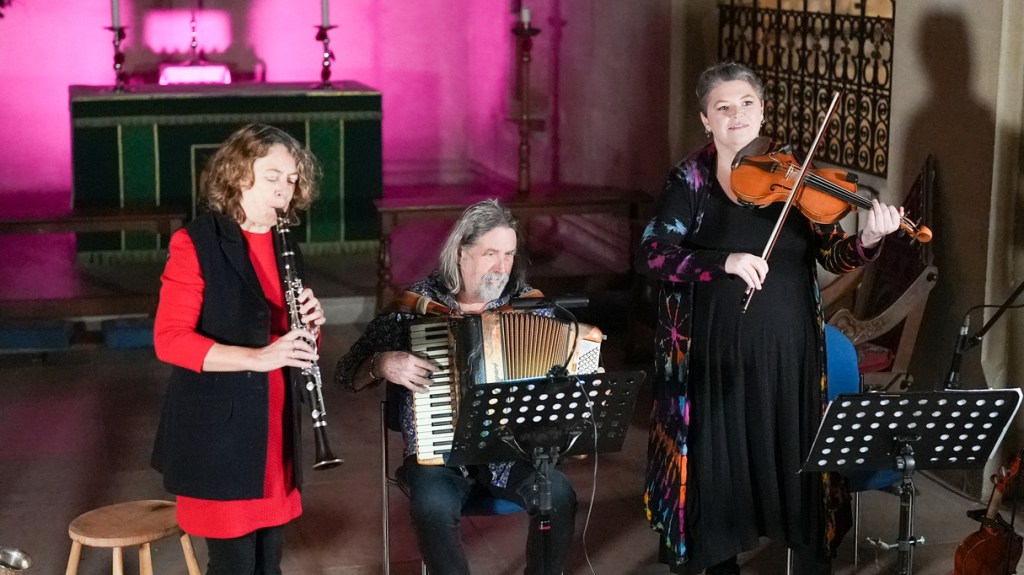 For this latest Pagoda Project line up, the inimitable Paul Hutchinson ( accordion) and Karen Wimhurst ( clarinet / bass clarinet ) are joined by the stellar fiddle singer Hannah Cumming.